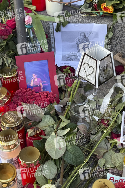Blumen, Kerzen und Fotos sind an einem Gedenkort für die verstorbene Rosenstolz-Sängerin AnNa R. am Theater des Westens zu sehen. Die Sängerin wurde 55 Jahre alt. Berlin, 22.03.2025