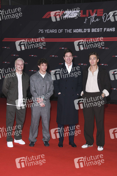 Valtteri Bottas, Andrea Kimi Antonelli, Toto Wolff und George Russell bei der Formel 1 Saison 2025 Eröffnungsfeier 'F1 75 Live' in der O2 Arena. London, 18.02.2025