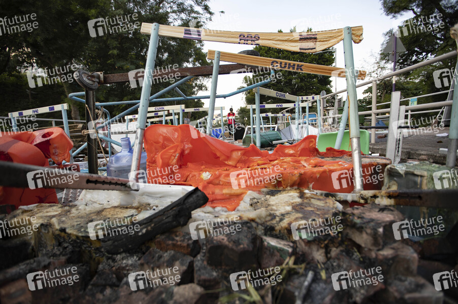 Verwüstung nach dem Kampf zwischen Studenten und Polizei - Kampf an der Chinese University Hong Kong (CUHK). Hongkong protestiert seit fünf Monaten ununterbrochen. Am Montag, dem 11. November 2019, begann ein Streik in der ganzen Stadt, der Teile von Hongkong zum Erliegen brachte, als MTR-Stationen geschlossen und mehrere Straßensperren errichtet wurden. Hongkong, 11.11.2019