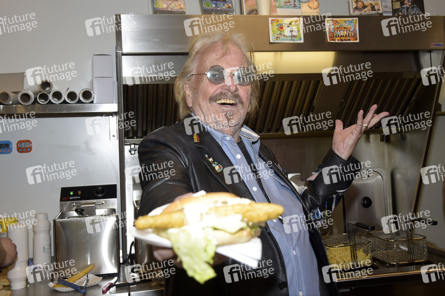 Frank Zander präsentiert sein neues Imbiss-Rezept 'Zander im Brötchen' im Würfel I. Das Backfischbrötchen à la Frank Zander gibt's demnächst exklusiv an den Würfel-Imbissen in Reinickendorf. Berlin, 14.04.2025