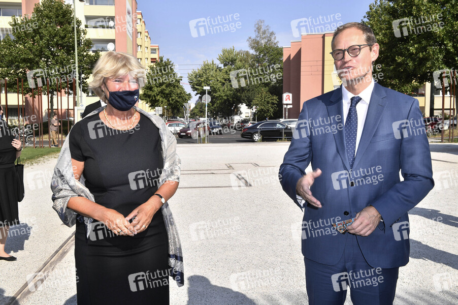 Monika Grütters und Michael Müller bei der Gedenkveranstaltung und Kranzniederlegung zum Jahrestag des Baus der Berliner Mauer in der Kapelle und am Denkmal der Gedenkstätte Berliner Mauer. Berlin, 13.08.2020