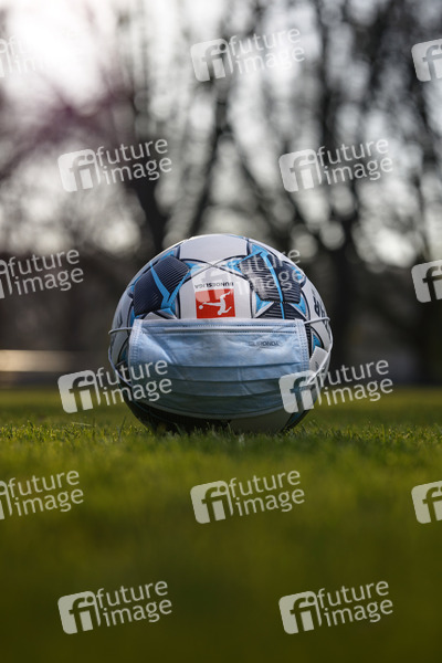 Der offizielle Spielball der Bundesliga Derbystar liegt mit Mundschutz auf einem Fußballplatz. Köln, 11.04.2020