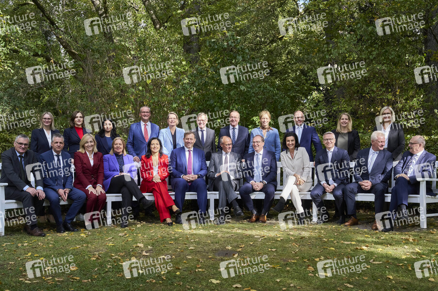 Stefan Kornelius, Natalie Pawlik, Thorsten Frei, Elisabeth Kaiser, Nina Warken, Reem Alabali-Radovan, Bärbel Bas, Katherina Reiche, Stefanie Hubig, Lars Klingbeil, Johann Wadephul, Friedrich Merz, Boris Pistorius, Alexander Dobrindt, Karin Prien, Dorothee Bär, Carsten Schneider, Karsten Wildberger, Verena Hubertz, Alois Rainer, Anette Kramme und Michael Meister bei der Kabinettsklausur mit anschließender 17. Kabinettssitzung der Bundesregierung in der Borsig-Villa Reiherwerder. Berlin, 30.09.2025