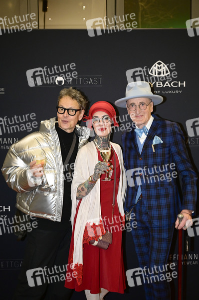 Rolf Scheider, Sarah Settgast und Günther Krabbenhöft bei der Präsentation der neuen exclusiven 'Sarah Settgast Kollektion by Hoffmann Natural Eyewear Kollektion' im Noble Optic House im Maybach Store Kurfürstendamm. Berlin, 29.11.2024