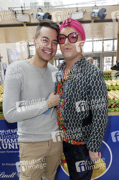Marcell Damaschke und Julian F.M. Stoeckel beim Charity Verkauf von Lindt Osterhasen zu Gunsten der Hamburger Tafel e.V. und der Budnianer Stiftung in der Europa Passage. Hamburg, 14.03.2024