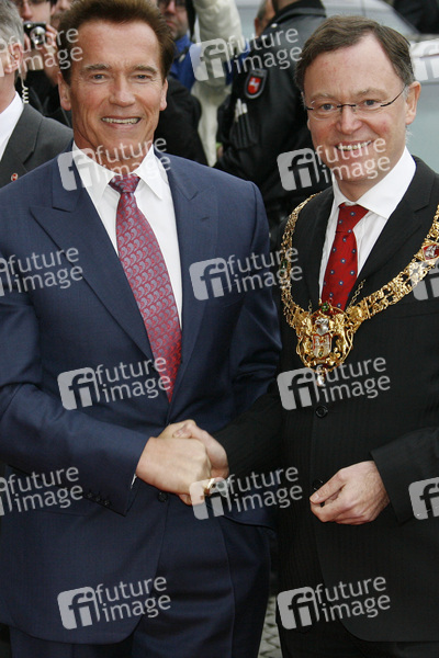 Hannovers Bürgermeister Weil empfängt den kalifornischen Gouverneur Schwarzenegger im Neuen Rathaus zum Eintrag ins Goldene Buch