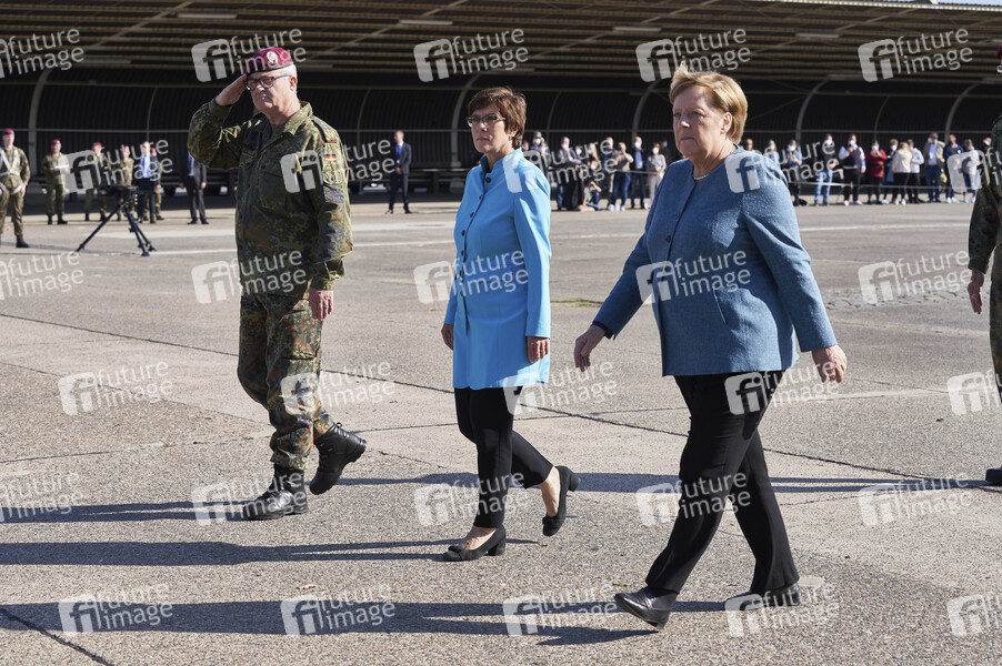 General Eberhard Zorn, Verteidigungsministerin Annegret Kramp-Karrenbauer und Bundeskanzlerin Angela Merkel bei einem Appell für die Soldatinnen und Soldaten der Evakuierungsmission in Kabul und dem Feierlichen Gelöbnis von Rekruten des Fallschirmjägerregiments 31 in der Fallschirmjägerkaserne Seedorf. Seedorf, 22.09.2021