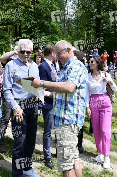 Gojko Mitic im Gespräch mit Jens Rußig, der 1966 in dem DEFA Indianerfilm das Baby spielte, bei der offiziellen Einweihung einer Sandstein-Stele in der Nähe des Originaldrehortes des Filmes 'Die Söhne der großen Bärin' im Kurort Rathen. Rathen, 19.05.2024