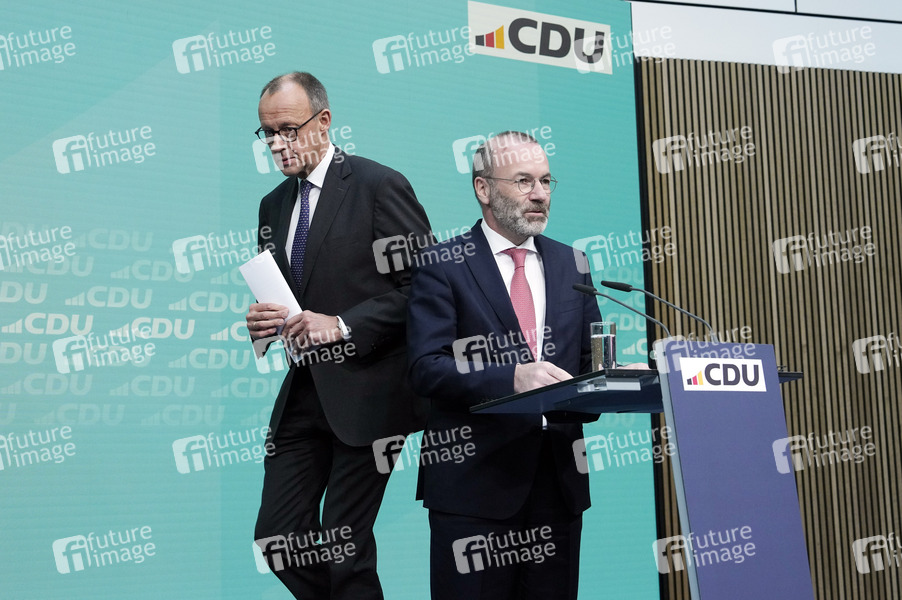 Friedrich Merz und Manfred Weber bei der Pressekonferenz im Nachgang der Klausurtagung der EVP im Konrad-Adenauer-Haus. Berlin, 18.01.2025