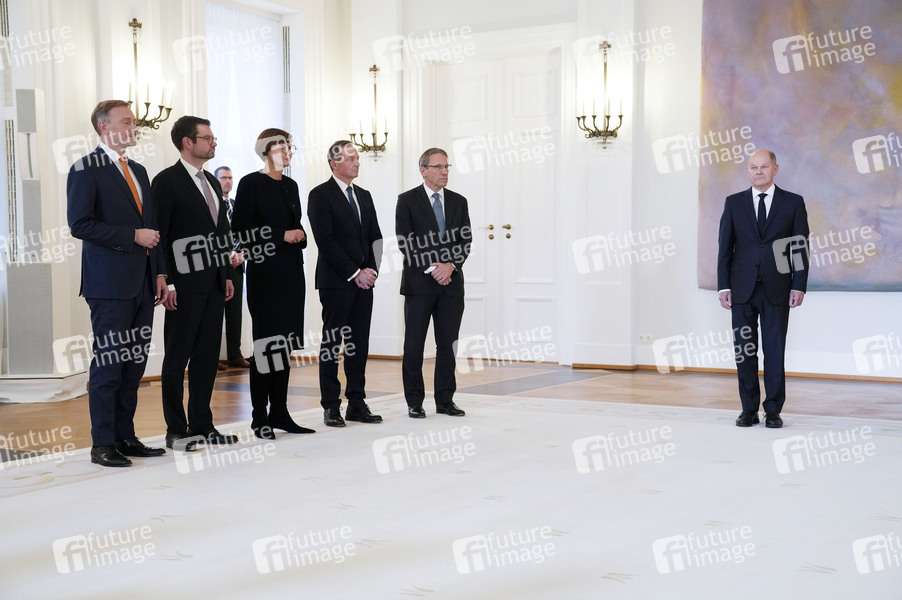 Christian Lindner, Marco Buschmann, Bettina Stark-Watzinger, Volker Wissing, Jörg Kukies und Olaf Scholz bei der Übergabe der Entlassungsurkunden gemäß Artikel 64 Abs. 1 Satz 1 des Grundgesetzes auf Vorschlag des Bundeskanzlers an den Bundesminister der Finanzen Christian Lindner, dem Bundesminister der Justiz Marco Buschmann und der Bundesministerin für Bildung und Forschung Bettina Stark-Watzinger sowie der Ernennungsurkunden für den neuen Justizminister Volker Wissing und den neuen Finanzminister Jörg Kukies im Schloss Bellevue. Berlin, 07.11.2024