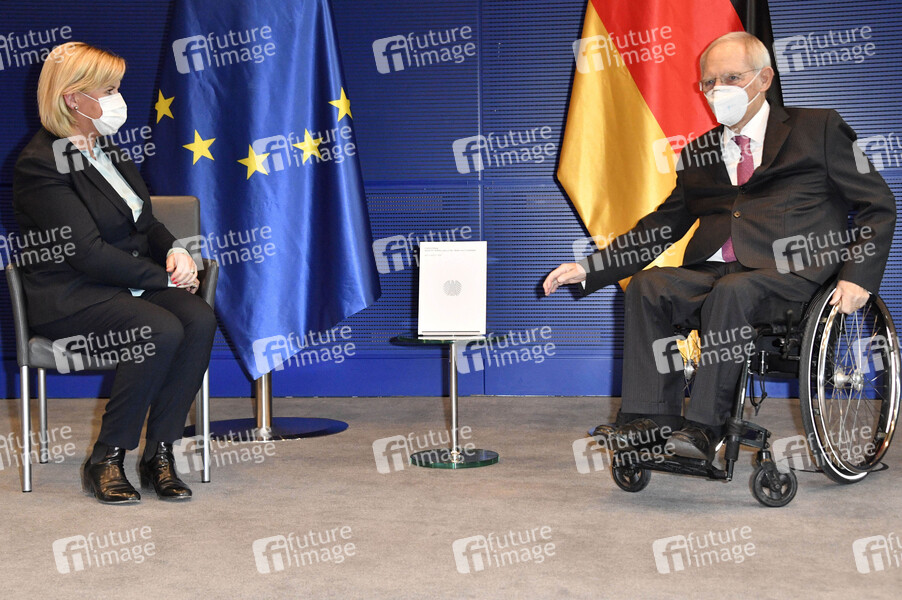 Eva Högl und Wolfgang Schäuble bei der Übergabe des Jahresberichts 2020 der Wehrbeauftragten an Bundestagspräsident Schäuble im Reichstagsgebäude. Berlin, 23.02.2021