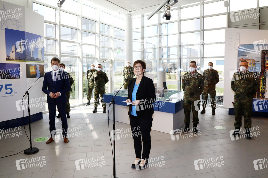 Bundesverteidigungsministerin Annegret Kramp-Karrenbauer und Ministerpräsident Michael Kretschmer bei der Unterzeichnung einer gemeinsamen Erklärung für einen Beitrag der Bundeswehr bei der Bewältigung des Strukturwandels im sächsischen Braunkohlerevier in der Lausitz im Kraftwerk Boxberg. Boxberg, 31.03.2021
