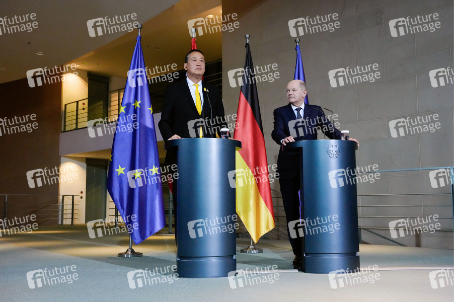 Srettha Thavisin und Olaf Scholz beim Empfang des Ministerpräsidenten von Thailand mit militärischen Ehren und zu einem gemeinsamen Gespräch mit dem Bundeskanzler und anschließendem Pressestatement im Bundeskanzleramt. Berlin, 13.03.2024