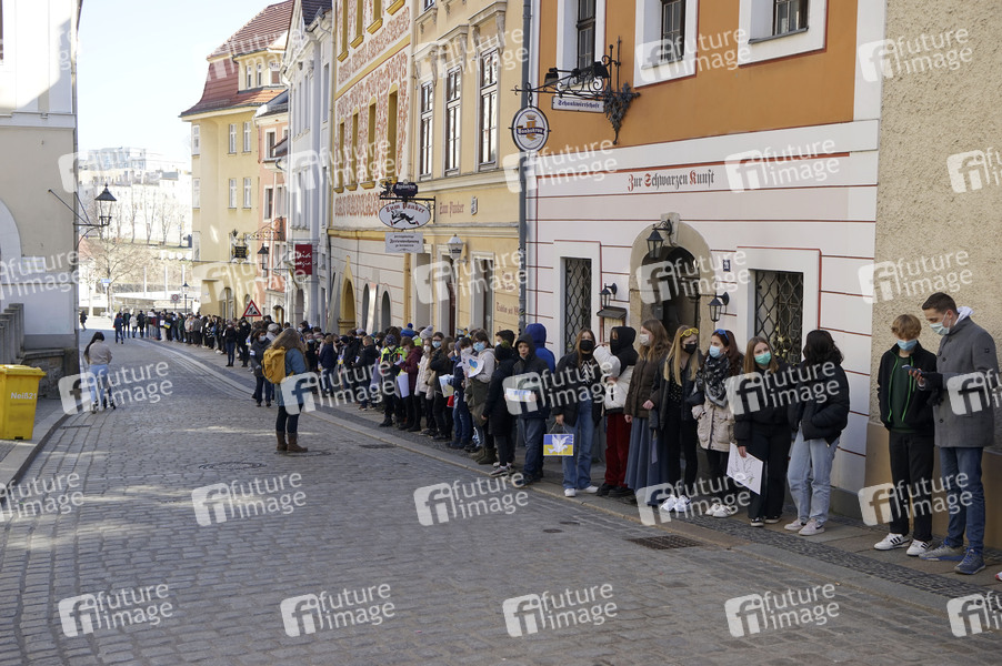 Initiiert vom Görlitzer Augustum-Annen-Gymnasium fanden sich ca. 1.000 Menschen zu einer grenzüberschreitenden Menschen-Kette zusammen, ausgehend von der Altstadtbrücke in beide Richtungen nach Zgorzelec und Görlitz. Mit dabei waren der Görlitzer Oberbürgermeister Octavian Ursu, sein Zgorzelecer Amtskollege Rafal Gronicz und Marcin Król, der Konsul der Republik Polen in Berlin. Görlitz, 09.03.2022