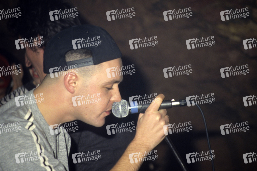 James Atkin von EMF live beim Rave in the Cave in den Clearwell Caves. London, 08.11.1992