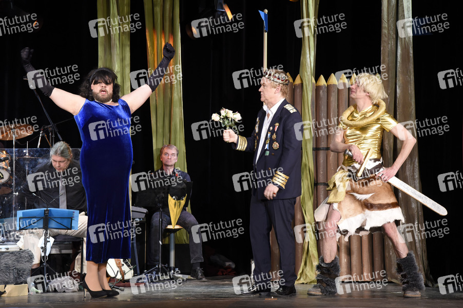 Thomas Wenke, Alexander Liegl und Severin Groebner bei der Generalprobe zum Streaming von 'Siegfried - Götterschweiß und Heldenblut, Ein Germanical' im Kleinen Theater. Haar, 07.03.2021