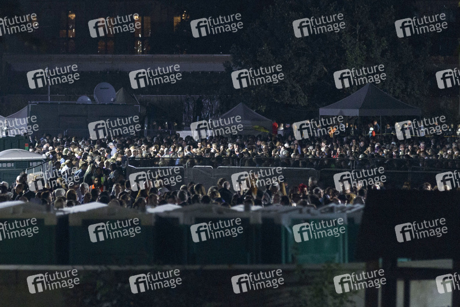 Menschschlange vor dem Londoner Parlament. Seit dem frühen Mittwochabend ist die Westminster Hall, in der der geschlossene Sarg der Queen aufgebahrt ist, durchgehend für die Öffentlichkeit geöffnet, damit sich die Landsleute von der gestorbenen Queen Elizabeth II verabschieden können. Schon zu Beginn zog sich eine Warteschlange etwa vier Kilometer weit durch das Zentrum der britischen Hauptstadt. Es wird mit Wartezeiten von bis zu 30 Stunden gerechnet. Angesichts der langen Wartezeit stehen Hunderte Helfer, Polizisten und Sanitäter bereit. Der Leichnam der Queen soll noch bis zur Trauerfeier am 19.09. aufgebahrt bleiben. London, 14.09.2022