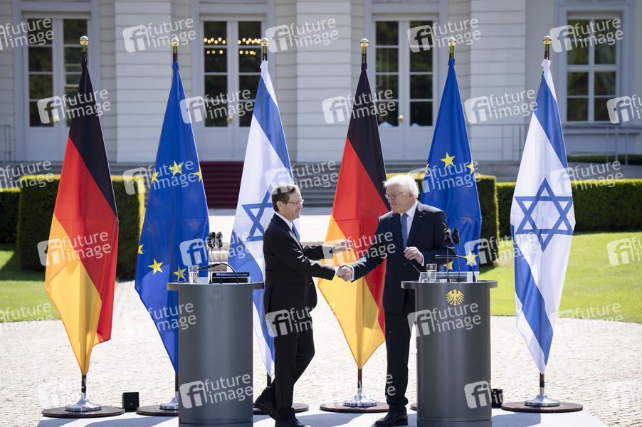 Isaak Herzog und Frank-Walter Steinmeier bei einer gemeinsamen Pressekonferenz des Präsidenten des Staates Israel und des Bundespräsidenten im Schloss Bellevue. Berlin, 12.05.2025