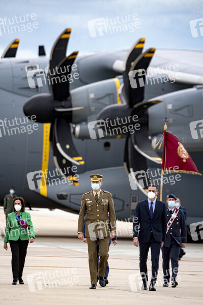 König Felipe VI. von Spanien, Margarita Robles und Pedro Sanchez beim Ehrenempfang auf der Torrejón Air Base für die letzten Soldaten die aus ihrem Einsatz in Afghanistan zurück kommen,. Die Beteiligung Spaniens am Krieg in Afghanistan begann am 27. Dezember 2001. Torrejón de Ardoz, 13.05.2021