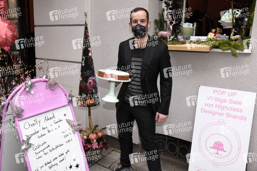 Chriz Bauer bei der CD-Präsentation von Sha und beim Glühwein-Verkauf am Glühweinfenster zugunsten von Frohes Herz e. V. im Cafe Rosa. München, 06.12.2020