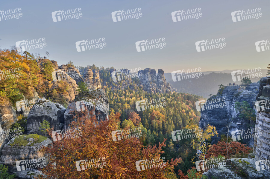 Blick von der Basteibrücke. Die Bastei ist eine Felsformation mit Aussichtsplattform in der Sächsischen Schweiz am rechten Ufer der Elbe auf dem Gebiet der Gemeinde Lohmen zwischen dem Kurort Rathen und Stadt Wehlen. Sie zählt zu den meistbesuchten Touristenattraktionen der Sächsischen Schweiz. Rathen, 30.10.2021