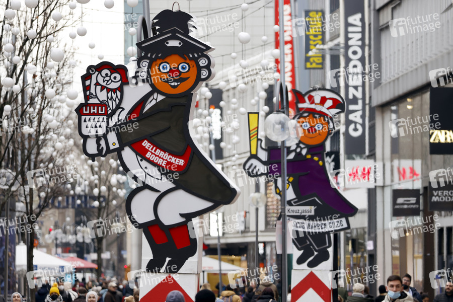 Auf der Kölner Schildergasse stehen beleuchtete Karnevalsfiguren der einzelnen Karnevalsgesellschaften. Sie markieren den Weg des Rosenmontagszugs, den es auch 2022 nicht geben wird, und sollen den Menschen in Corona-Zeiten ein Gefühl von Fastelovend vermitteln. (Themenbild, Symbolbild) Köln, 10.02.2022