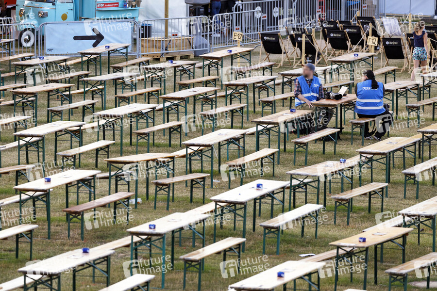 Leere Stuhlreihen beim Auftritt einer Band im Kulturgarten in der Bonner Rheinaue. Die Corona-Krise macht vielen Veranstaltern arg zu schaffen. Das Bonn Live Kulturgarten Open Air Festival 2020 ist Europas erstes Open Air Musik Festival unter Corona-Auflagen wegen der Covid-19 Pandemie. Bonn, 22.07.2020