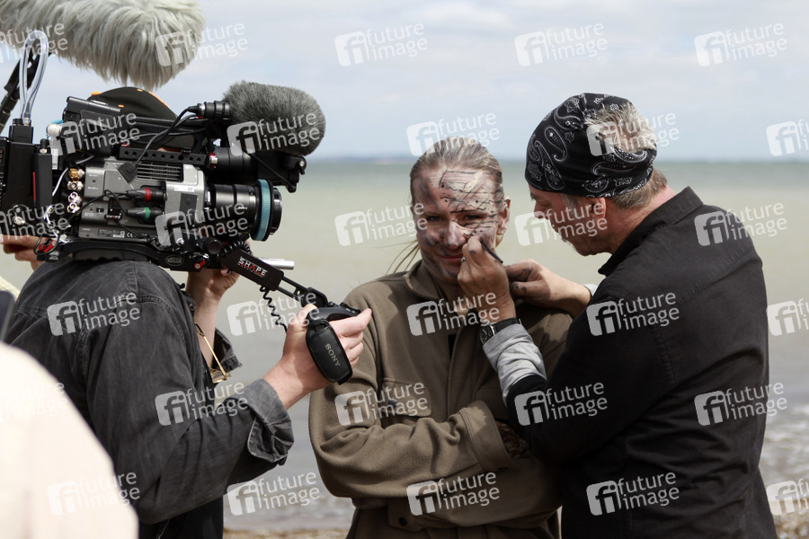 Nature Art: Ostseestrand Bodypainting und Photoshooting mit Model Katey an der Ostseeküste am Behrensdorfer Strand. Begleitet wird die Körperkunstaktion von einem Filmproduktionsteam aus Hamburg für einen dokumentarischen ARD/NDR-Fernsehbeitrag. Behrensdorf, 31.08.2022 - Bodyart-Künstler: Jörg Düsterwald