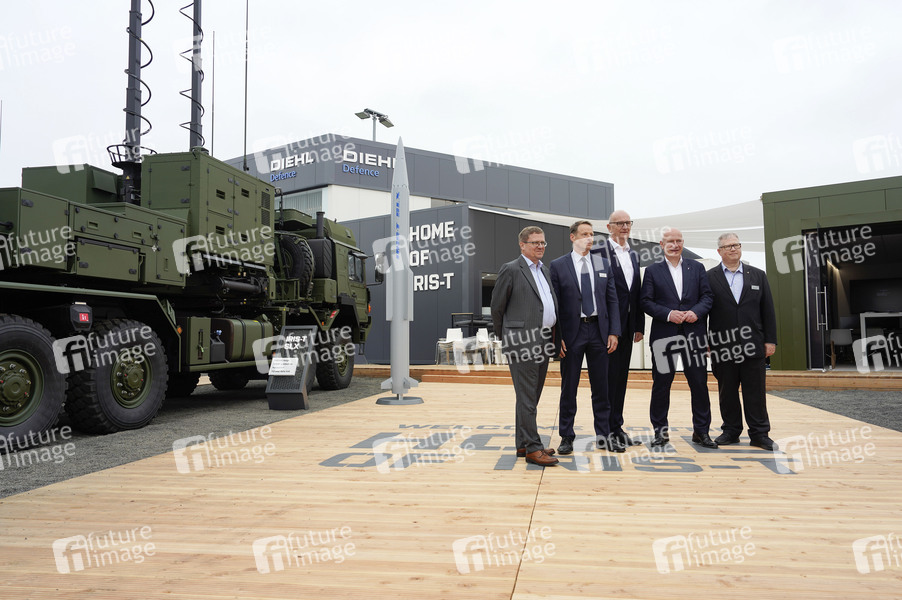 Dietmar Woidke und Kai Wegner mit David Voskuhl von Diehl Defence beim Rundgang vor der Eröffnung der ILA Berlin auf dem ILA-Gelände am Flughafen BER Berlin-Brandenburg. Berlin, 03.06.2024