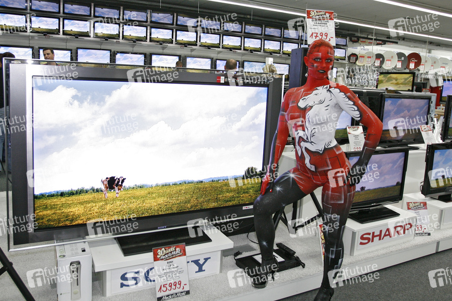 Bodypainting, LCD-Fernseher, TV, Erotik, Frau, nackt, drinnen, weiblich, Muster, erotic, woman, nude, indoor, female, TV set, television