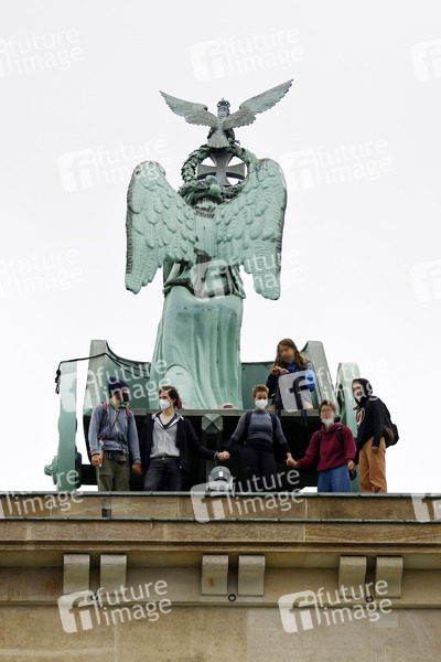 Im Rahmen einer Aktionswoche haben Klimaschutz-Aktivisten den Platz am Brandenburger Tor blockiert. Am frühen Morgen kletterten zudem mehrere Personen auf das Brandenburger Tor. Berlin, 20.08.2021