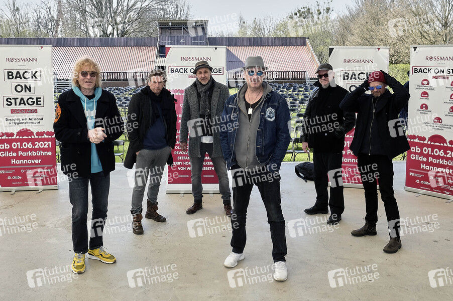 Christof Stein-Schneider, Rainer Schumann, Thorsten Wingenfelder, Kai Wingenfelder, Gero Drnek und Christian Decker beim 'Back on Stage'-Pressetermin von Hannover Concerts zur Vorstellung vom Konzertsommer 2021 mit Fury in the Slaughterhouse auf der Gilde Parkbühne. Hannover, 16.04.2021