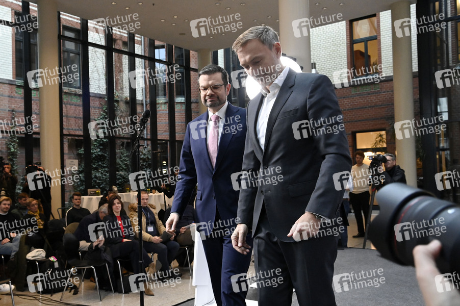 Marco Buschmann und Christian Lindner bei der Presseskonferenz der FDP zur Vorstellung des neuen Generalsekretärs Marco Buschmann im Hans-Dietrich-Genscher-Haus. Berlin, 02.12.2024