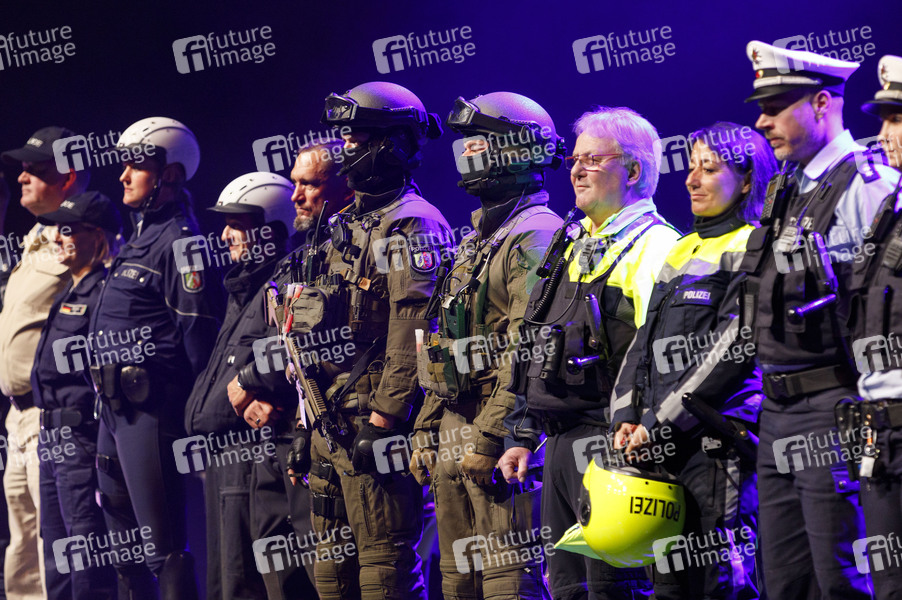 Vertreter der verschiedenen Polizeidienste bei der Vereidigung von neuen Kommissaranwärterinnen und Kommissaranwärtern samt traditionellem Mützenwurf in der Lanxess-Arena. Köln, 03.04.2019
