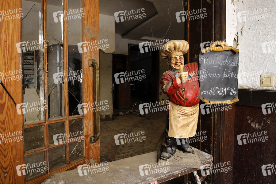 Nach dem Jahrhunderthochwasser in der Eifel durch heftige Regenfälle und Dauerregen mit Überschwemmungen und Überflutungen haben die Aufräumarbeiten im Ahrtal begonnen. Einheiten von Polizei, THW, Bundeswehr und Feuerwehr mitsamt vielen freiwilligen Helfern räumen Straßen, entfernen Schutt und Schlamm und versorgen die Menschen. Im Bild zerstörte Häuser in der Ortschaft Altenahr, in der die Flut viele Häuser zerstörte, 22.07.2021