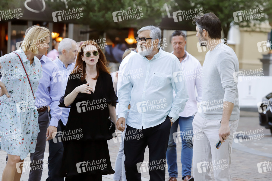 Julianne Moore mit Ehemann Bart Freundlich und Festivalleiter Jiri Bartoska bei einem Stadtbummel auf dem 54. Internationalen Filmfestival Karlovy Vary 2019. Karlsbad, 27.06.2019