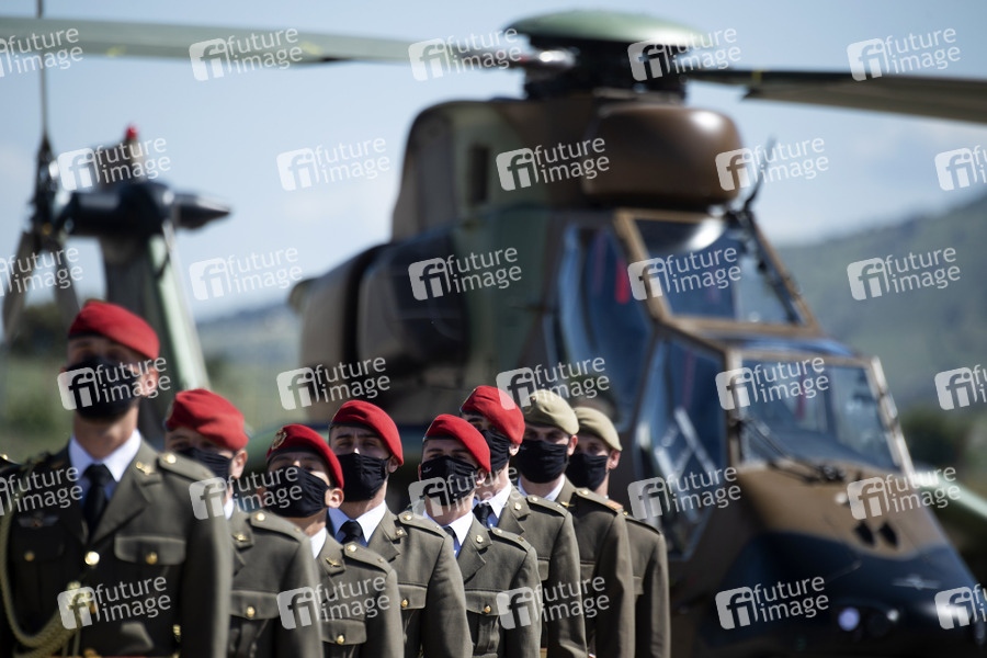 Soldaten bei der Zeremonie der Übergabe der Nationalflagge an die ACAVIET (Luftfahrtakademie der Armee) in der Helipuerto Base Coronel Mate. Colmenar Viejo, 07.05.2021
