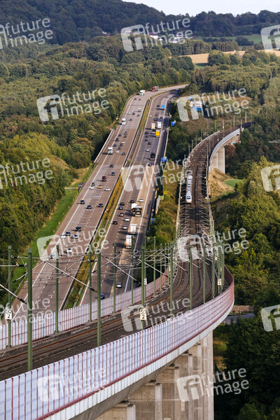 Hallerbachtalbrücke, Mobilität, Eisenbahn vs. Auto, Autobahn, Bundesautobahn, A3, Schnellfahrstrecke, Schnellstrecke, Hochgeschwindigkeitstrasse, Hochgeschwindigkeitsverkehr, HGV-Strecke, HGV-Trasse, Geschwindigkeit, ICE, ICE-Strecke, Deutsche Bahn, DB, Eisenbahn, Streckenkilometer 50, Spannbeton-Hohlkastenbrücke, Brückenbauwerk, E -Mobility, End-to-End-Tourismus, Langsamverkehr, Stau, Mixed Mobility, Fahrzeuge, Wagons, Personenverkehr, Fernverkehr, Klimaziele, Verkehr, Reisen, Bahnstrecke, Infrastruktur, Intercity Express, Zugstrecke, Schienennetz, Gleise, Bahnreisen, Bahn fahren, ICE-Trasse, Fahrgastaufkommen, Fahrgastzahlen, Streckenbelastung, Stau, Staugefahr, Wagon, Schnellzug, Streckennetz, Gleisbett, Zug, Züge, Verkehrsmittel, Bahnbrücke, Eisenbahnbrücke, Archivfoto, Symbolbild, Symbolfoto