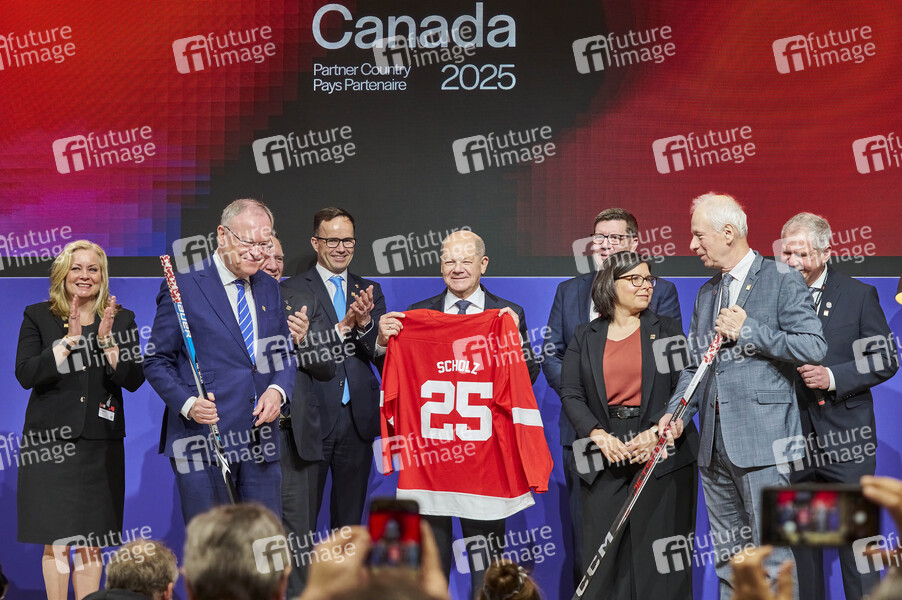 Stephan Weil, Jochen Köckler, Olaf Scholz, Stephane Dion und Vertreter Kanadas beim Eröffnungsrundgang auf der Hannover Messe 2025 auf dem Messegelände. Hannover, 31.03.2025