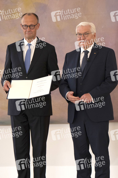 Friedrich Merz und Frank-Walter Steinmeier bei der Ernennung des Bundeskanzlers und des Bundeskabinetts im Schloss Bellevue. Berlin, 06.05.2025