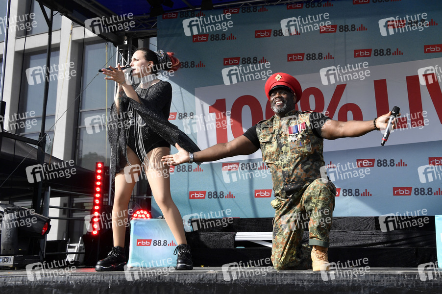 Michelle Stanley und Bruce Lacy von Captain Jack live beim 90er Drive-In-Konzert von rbb 88.8 auf dem Messegelände. Berlin, 21.05.2020