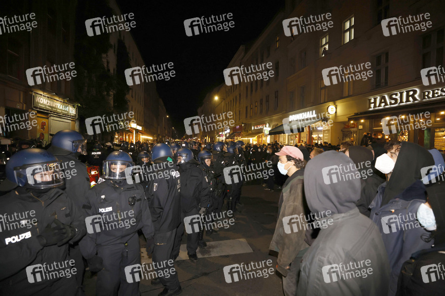 Bei einer Demo gegen die Räumung des linksautonomen Bauwagen-Camps 'Köpi' in Berlin-Kreuzberg ist es zu Ausschreitungen gekommen. Dabei wurden Polizisten mit Flaschen, Steinen und Feuerwerkskörpern beworfen. Unbekannte haben in der Reichenbergerstraße Scheiben mehrerer Autos zerschlagen, Verkehrsschilder in parkende Autos gerammt und Dixieklos umgeschubst. Laut Polizei waren 7.000 bis 8.000 Teilnehmer vor Ort. Berlin, 15.10.2021