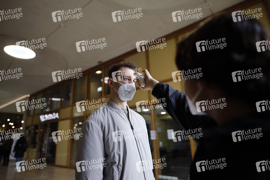 In der Ehrenfelder Ditib Moschee können sich Kölner am Wochenende gegen das Coronavirus impfen lassen. Zur Verfügung stehen Dosen des Impfstoffes von Astrazeneca sowie Johnson & Johnson. Am Eingang wird bei allen Bürgern Temperatur gemessen. Köln, 08.05.2021