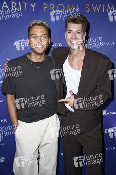 Malik Harris und Maximilian Seitz beim Charity Promi Swim Event 2025 von Maximilian Seitz zugunsten von 'Kindeswohl-Berlin' im Hotel Pullman Berlin Schweizerhof. Berlin, 24.07.2025