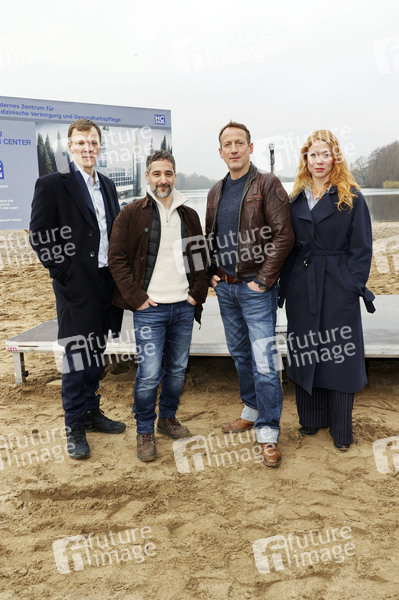 Sebastian Hülk, Denis Moschitto, Wotan Wilke Möhring und Esther Roling beim Fototermin am Set der Doppelfolge des ARD-Krimis 'Tatort - Ein guter Tag / Schwarzer Schnee' am Eichbaumsee in Moorfleet. Hamburg, 27.11.2024