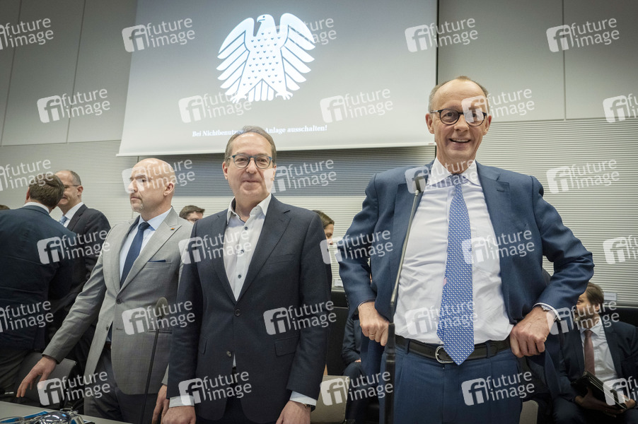 Alexander Hoffmann, Alexander Dobrindt und Friedrich Merz in der Fraktionssitzung der CDU/CSU-Bundestagsfraktion im Reichstagsgebäude. Berlin, 10.02.2025