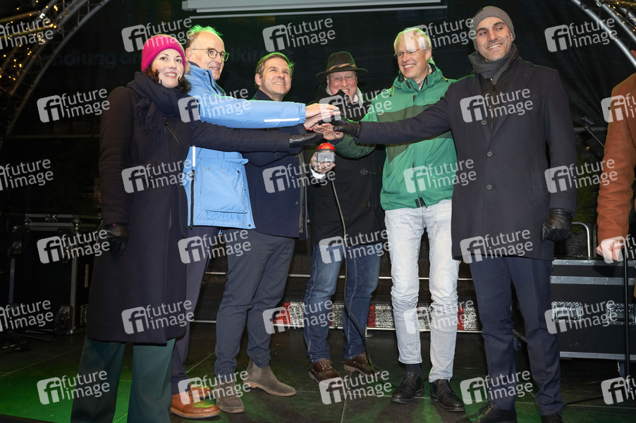 Dany Schrader (Chefredakteuriin Hannoversche Allgemeine), Ralf Meister (Landesbischof), Kevin Kratzsch (Vizepräsident Deutscher Schaustellerbund), Gast, Rainer Müller-Brandes(Stadtsuperintendent) und Belit Onay (Oberbürgermeister von Hannover) bei der Eröffnung des Weihnachtsmarktes 2022 an der Marktkirche. Hannover, 21.11.2022