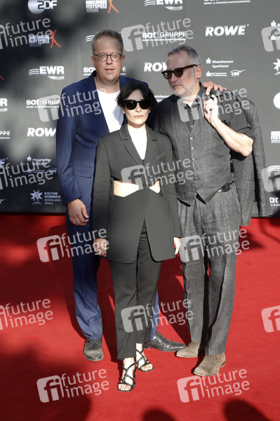 Thomas Laue, Mina Salehpour und Roland Schimmelpfennig bei der Premiere des Stücks 'See aus Asche - Das Lied der Nibelungen' der Nibelungen-Festspiele 2025 auf der Open-Air-Bühne vor dem Wormser Dom. Worms, 11.07.2025