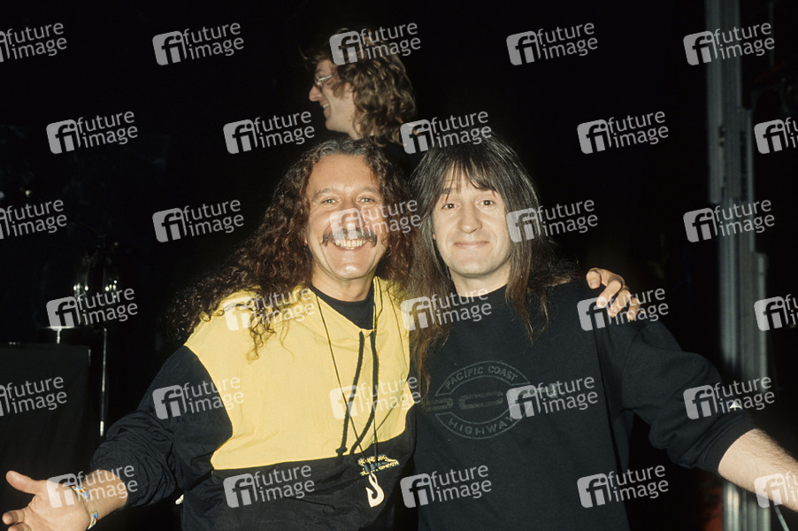 Mick Box und Trevor Bolder von Uriah Heep beim Soundcheck vor dem Konzert im Astoria Theatre. London, 15.03.1991