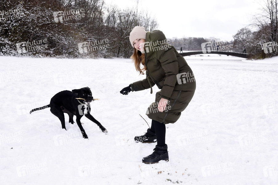 Lena Meckel mit ihrem Hund Ludwig beim Winterspaziergang im Ostpark. München, 07.01.2021